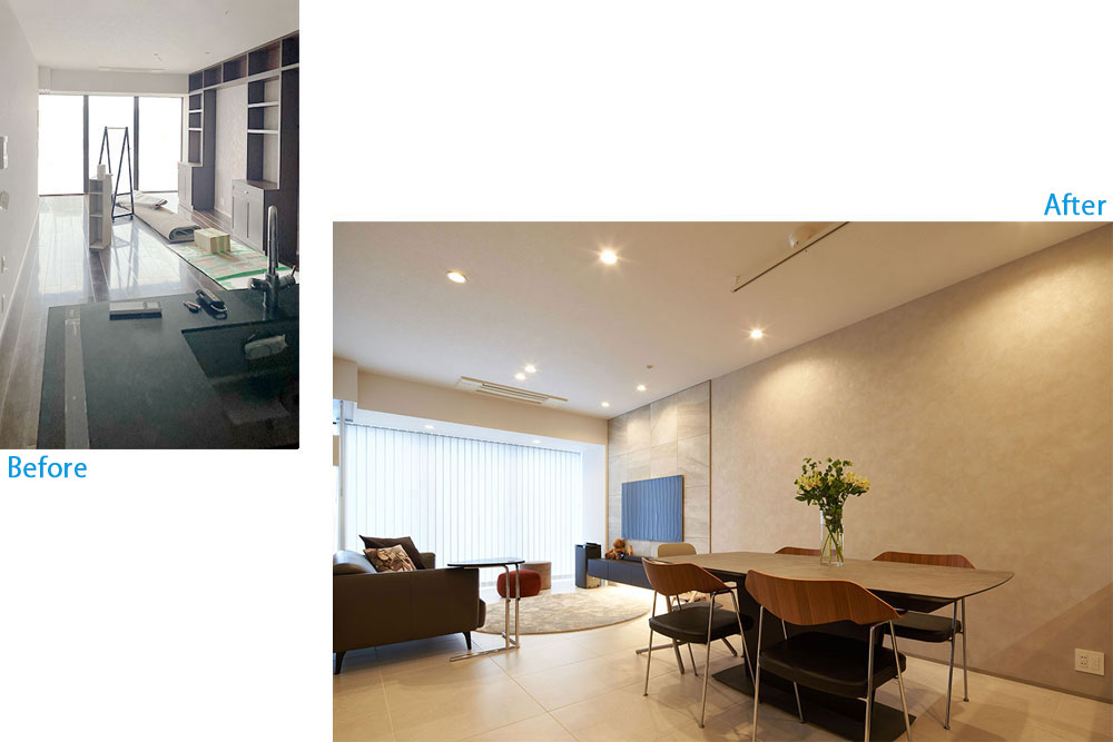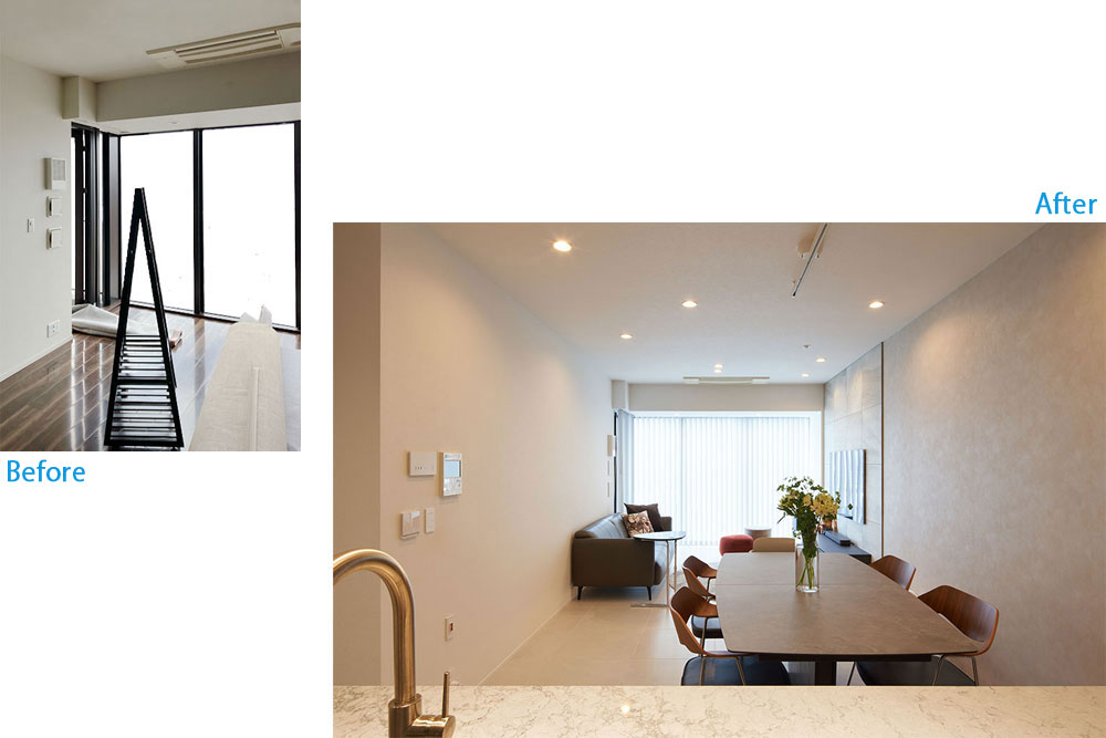 プロとしての空間コーディネートの提案を希望され、設備機器は基本的にご自身で決める方向で、メイン空間であるLDKと主寝室に焦点を絞って、デザイン提案を進めて行く方法をとりました。