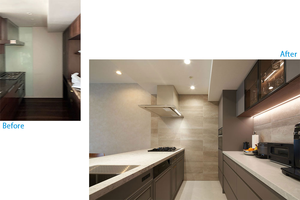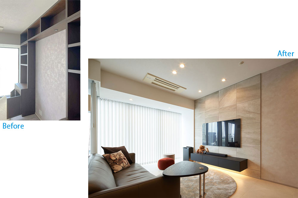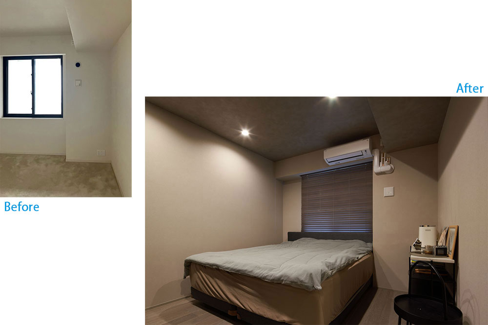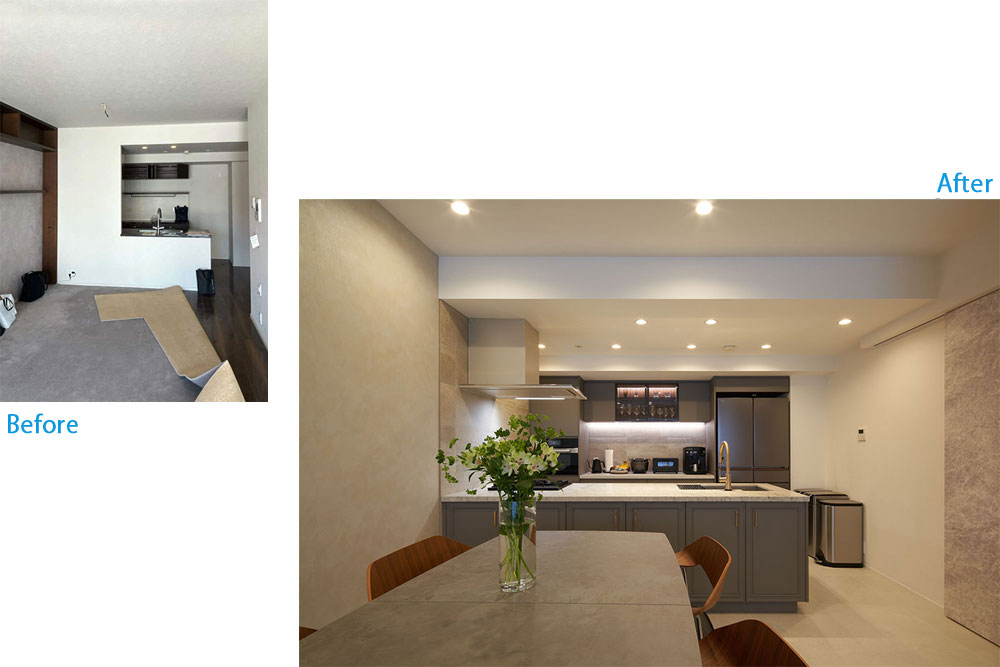 お客様の選ばれた壁掛けテレビ、冷蔵庫、ダストBOX、キングサイズベッド、ワインセラーのサイズのヒアリングから、搬入経路、動作導線、使い勝手を予め現場にて検証し、各メーカーに詳細を電話確認したり施工説明書を確認したりした上で、1mm単位で全てを配置していき、空間の実現を可能にしました。