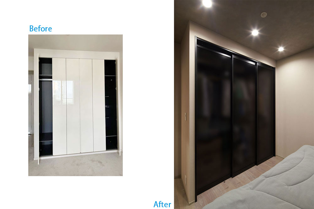 また建具中央部には強化ガラスにフィルムを貼り収納内部を見えにくくし、建具本体のスタイリッシュさを前面にデザイン。