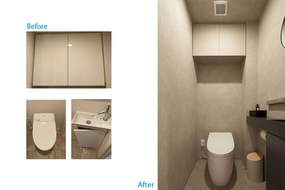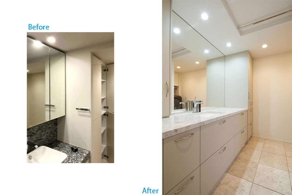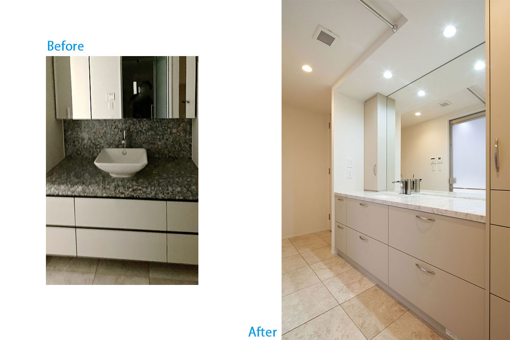 既存収納があった部分も取り壊し、横幅約2m35cmの巨大な豪華洗面台に改装。